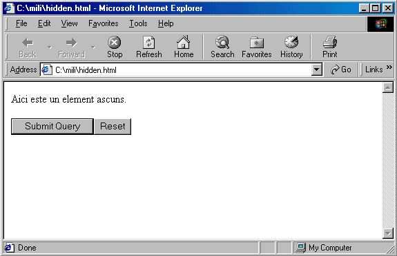 <form action=/cgi-bin/post-query method=POST> <input type=hidden name=add value=wwwuser@www.ro> Aici este un element ascuns. <p> <input type=submit><input type=reset> </form>