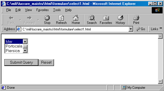 <form action=/cgi-bin/post-query method=POST> <select name=fructe size=3> <option>Banana <option selected>Mar <option value=Fructul-preferat>Portocala <option>Piersica </select><p> <input type=submit><input type=reset> </form>